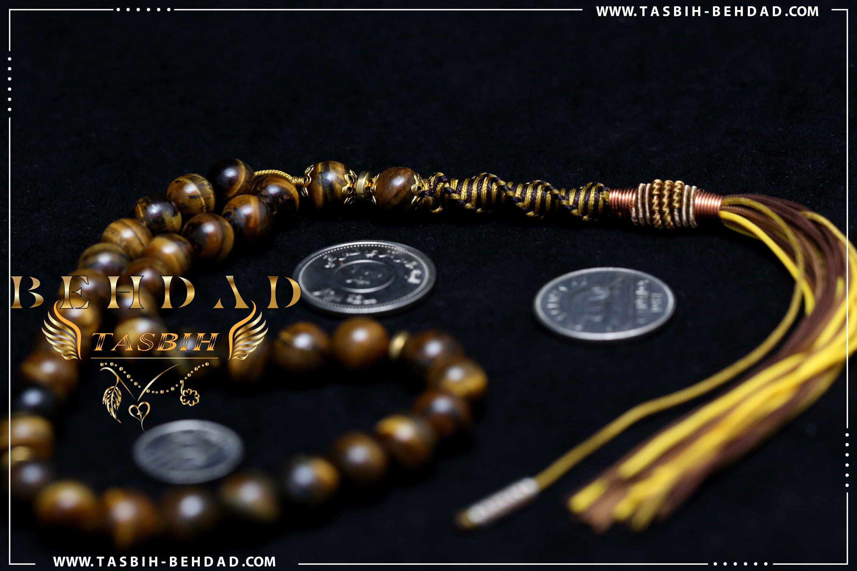 این تسبیح از 33 عدد مهره سنگ معدنی پرخاصیت چشم ببر یا تایگر سایز 8 میلیمتر ساخته شده.