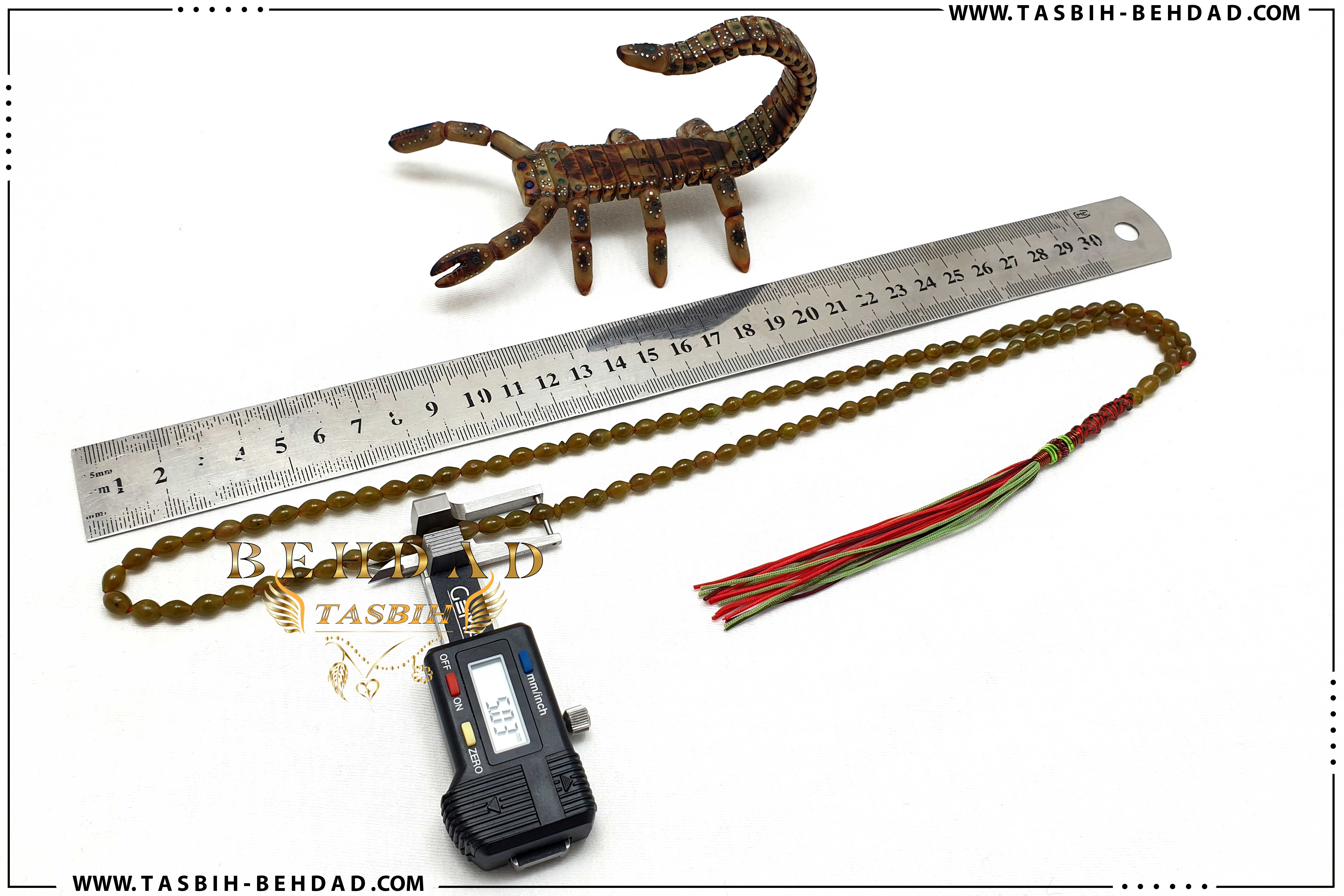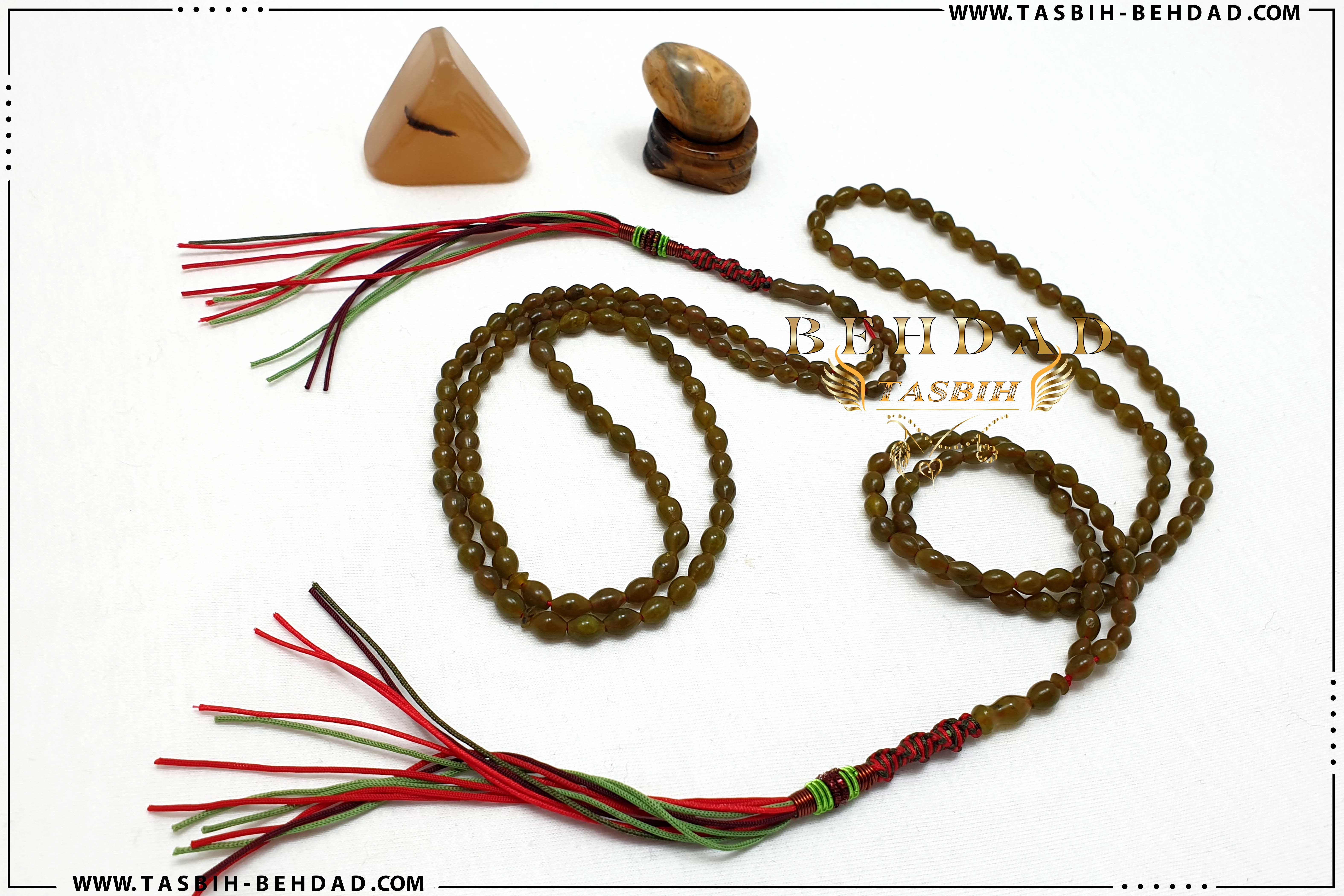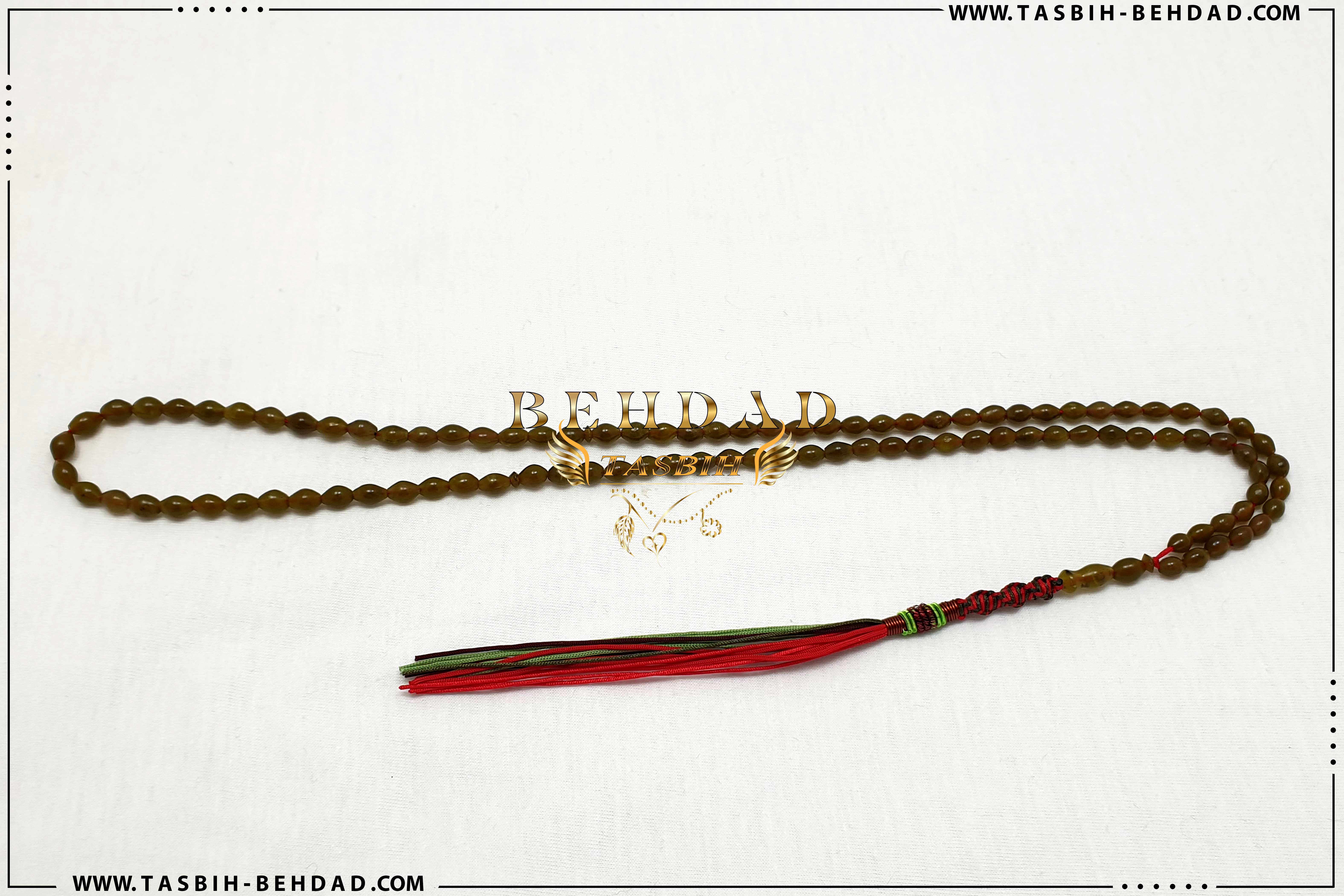 این تسبیح از 101 عدد مهره سنگ شاه مقصود خرمایی قندهار افغانستان ، با اصالت و بسیار زیبا سایز 5 میلیمتر ساخته شده است. نخ های بکار رفته در این تسبیح ، خارجی و از بهترین برند موجود در بازار بوده که به این راحتی ها پاره نشده و کِش نمی آیند. بافت مکرومه محکم و خوش رنگ در این تسبیح ، موجب زیبایی دو چندان آن شده است. سیم و فنر این تسبیح زیبا نیز ، برزیلی بوده و دارای رنگ ثابت و استحکام بالا می باشد. این تسبیح که توسط کارگاه تولید تسبیح بهداد مونتاژ شده ، همراه با باکس مخصوص، حضورتان تقدیم میگردد.