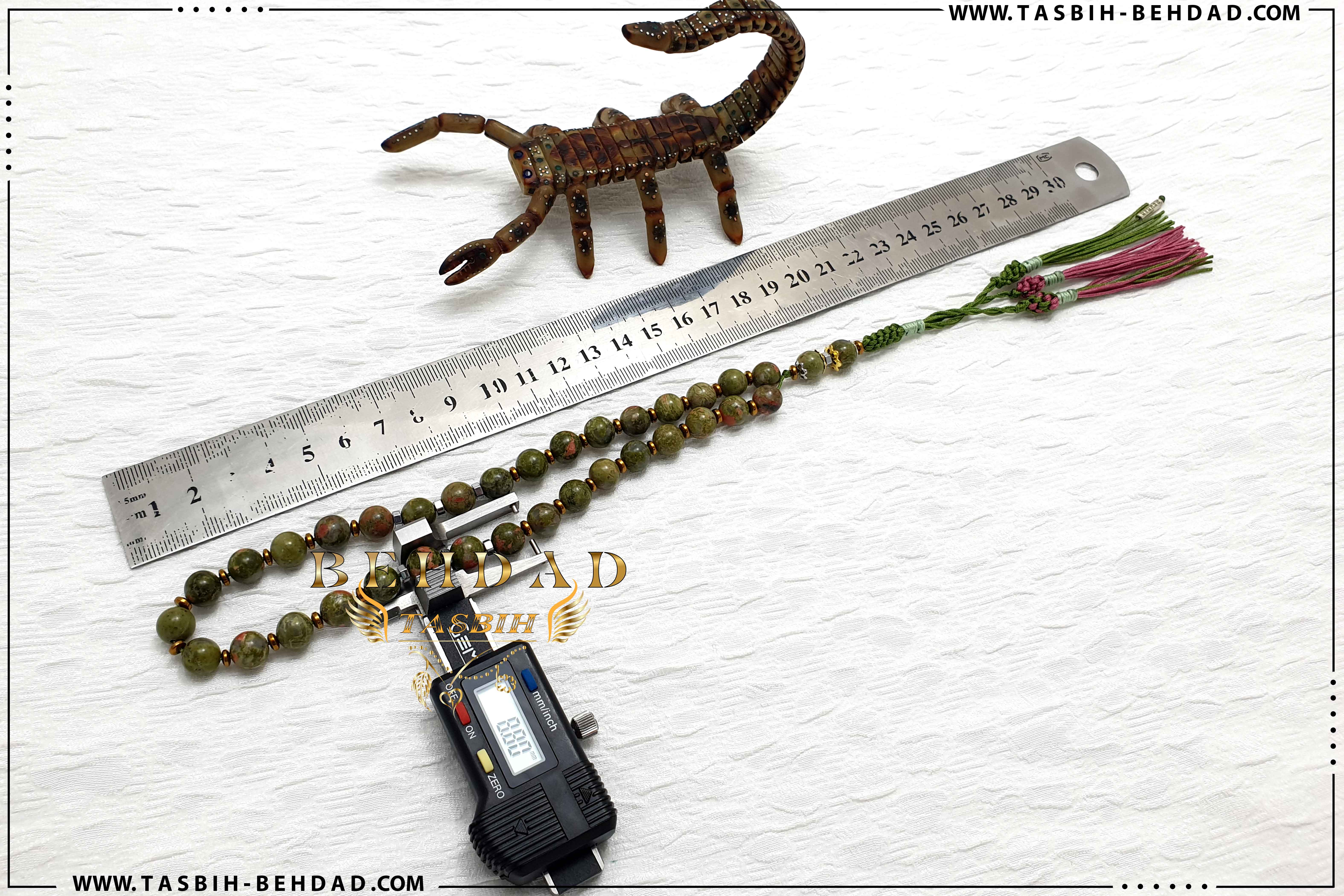 این تسبیح از 33 عدد مهره سنگ طبیعی پرخاصیت جاسپر سایز 9 میلیمتر تشکیل شده است. سنگ های جاسپر بکار رفته در این تسبیح، کاملا اصلی و بسیار با کیفیت می باشد. سایز مهره ها توسط دستگاه کولیس با دقت بالا اندازه گیری شده و به ترتیب کنار هم چیده شده اند. نخ های بکار رفته در این تسبیح، خارجی و از بهترین برند موجود در بازار بوده که به این راحتی ها پاره نشده و کِش نمی آیند. بافت محکم و خوش رنگ در این تسبیح، موجب زیبایی دو چندان آن شده است. این تسبیح که توسط کارگاه تولید تسبیح بهداد ساخته شده ، با مهر نقره بهداد ، همراه با باکس مخصوص ، حضورتان تقدیم میگردد.