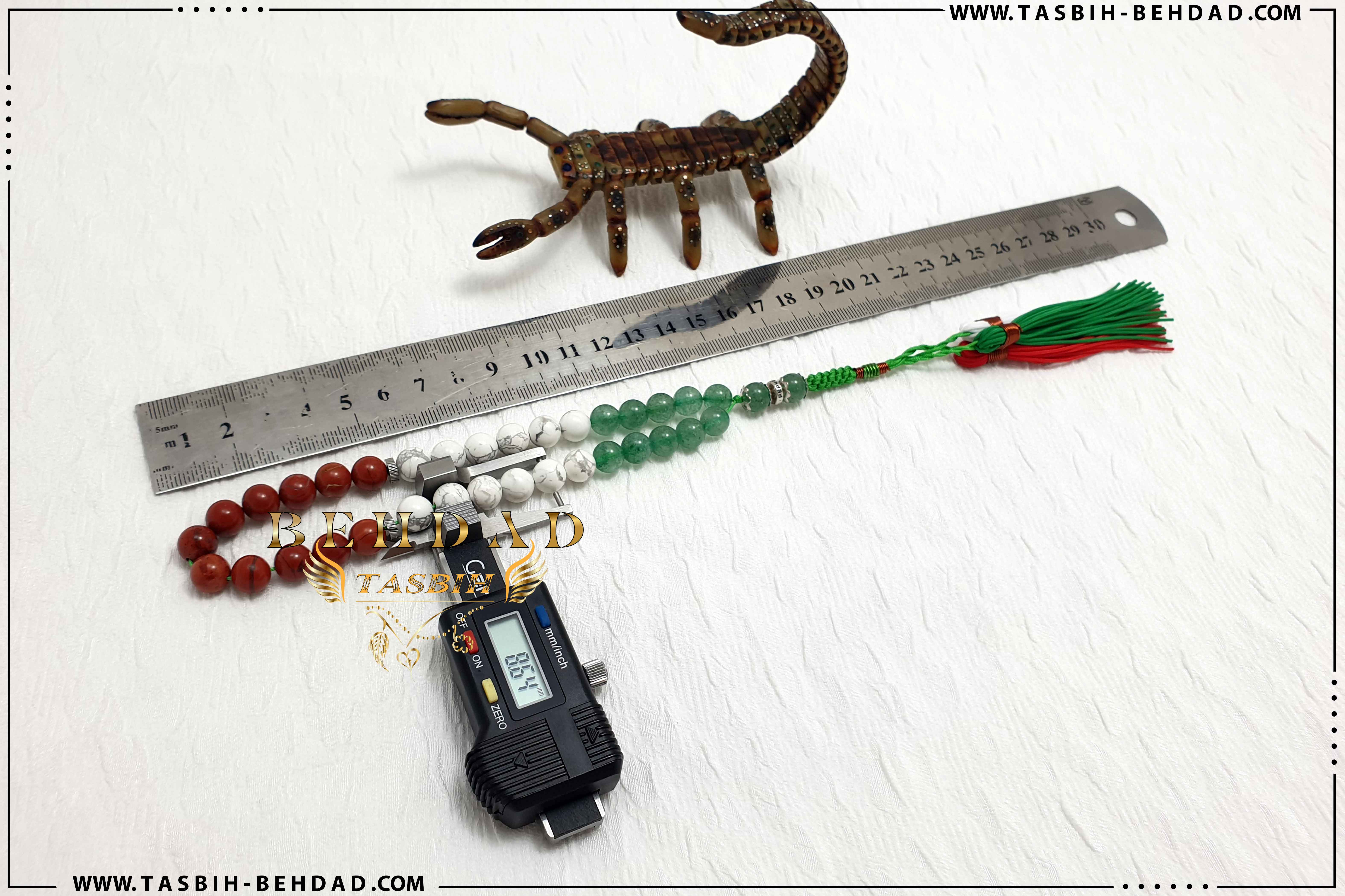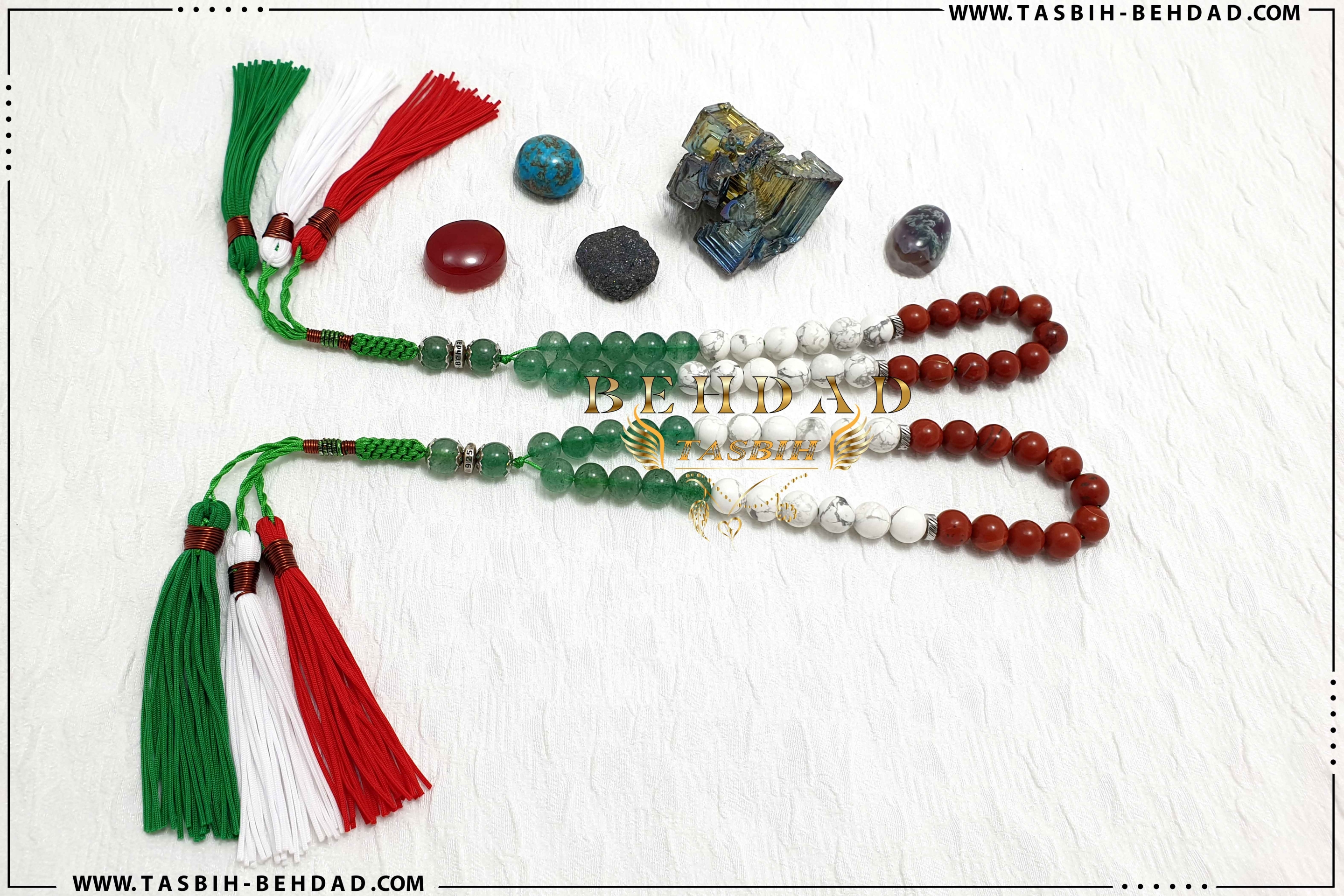 این تسبیح از 33 عدد مهره سنگ طبیعی و پرخاصیت ب صورت میکس سنگ های اونتورین ، هاولیت و جاسپر قرمز سایز 8 الی 9 میلیمتر با اشاره ب پرچم زیبای (ایران ، ایتالیا ، مکزیک) توسط تیم ما برای شما عزیزان طراحی و تولید شده است. سنگ های بکار رفته در این تسبیح، دارای گرید A و بسیار با کیفیت می باشد. سایز مهره ها توسط دستگاه کولیس با دقت بسیار بالا اندازه گیری شده و به ترتیب کنار هم چیده شده اند. نخ های بکار رفته در این تسبیح، خارجی و از بهترین برند موجود در بازار بوده که به این راحتی ها پاره نشده و کِش نمی آیند. بافت محکم و خوش رنگ در این تسبیح، موجب زیبایی دو چندان آن شده است. سیم و فنر این تسبیح زیبا نیز، برزیلی بوده و دارای رنگ ثابت و استحکام بالا می باشد. این تسبیح زیبا همراه با باکس مخصوص ، حضورتان تقدیم میگردد.
